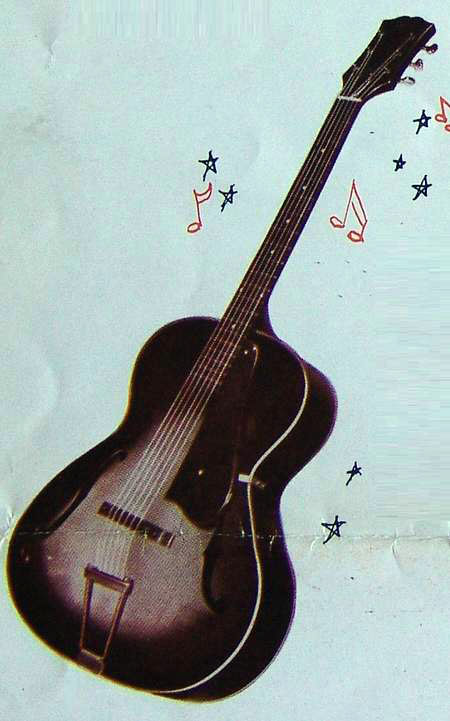 All the basic features of the highest priced Guild Guitars in a low-priced model designed for the student-professional artist. Three-peice Honduras mahogany neck with Adjusto truss rod. Fingerboard of select rosewood, with pearl position markers. Finished in hand-rubbed, rich sunburst. 16 1/4" wide, 20 1/4" long. Unquestionably the greatest value in superbly crafter low-price acoustic guitars.