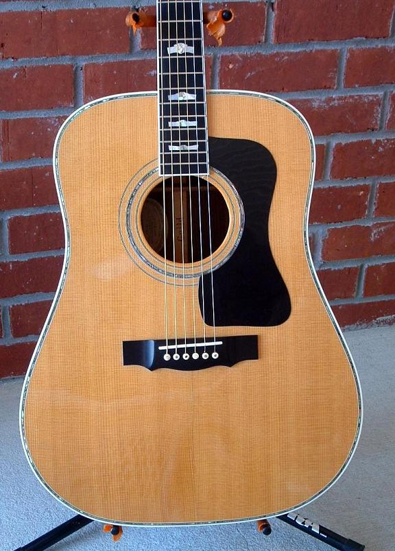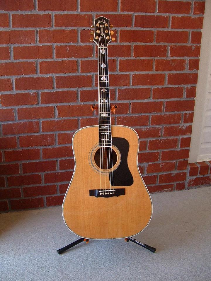 Guild's rosewood "Deco" dreadnought combines traditional Guild elements of pearl and abalone inlay with the delicate patterns of the Art Deco period, to produce an instrument that is both visually stunning and a pleasure to play. Bound in delicate abalone, the AAA grade solid spruce top is hand-tuned to optimize the powerful, balanced tone that's been a Guild tradition for 45 years. Custom Shop luthiers shave and scallop the tone bars into Guild's special "Floating X" pattern.