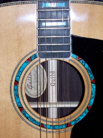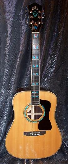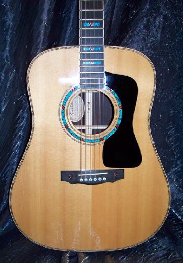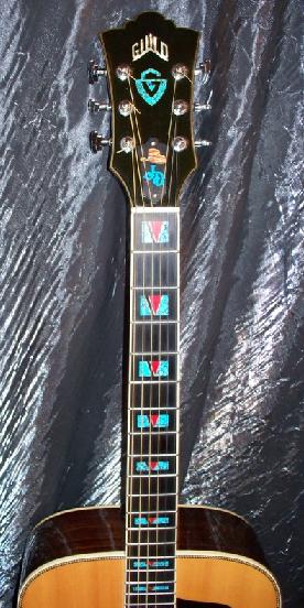 Based upon the successful DV52, the DV73 features a AAAA feathered spruce top, G Shield logo, inlay's of red coral, turquoise, and black onyx, Grover Imperial tuners and Herrigbone binding. Only 50 DV73's built.