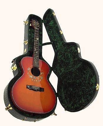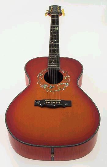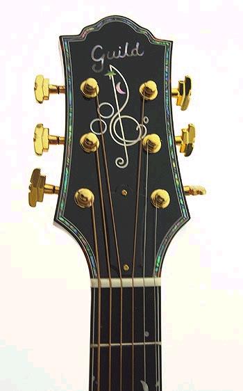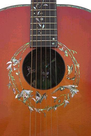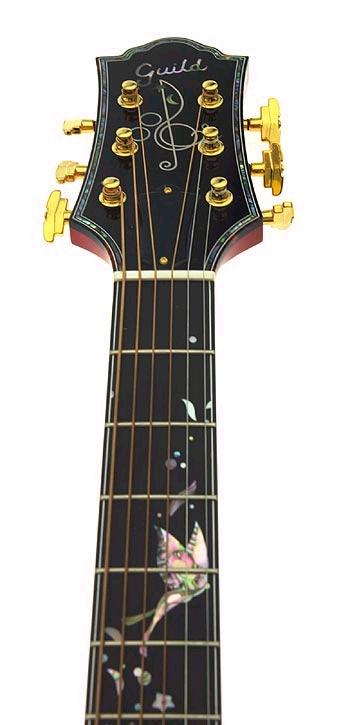 Inside the Guild guitars, visible through the soundhole, is a hand painted portrait of The Sprite, the spirit of Nature. Circling around her face are butterflies of carved and engraved abalone. The inlay and ornamentation for these Guild guitars was designed by Chris Schnabel and Edgar Reynolds of Disney. They spent many hours working on the right designs, using bits and pieces of unfinished guitars to build their model.