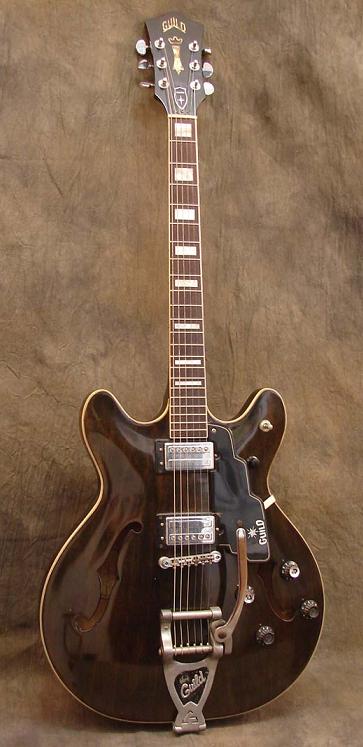 The Guild Starfire V returns to the line in 1999. Jazz, blues, rock or swing—any style sounds great on this classic semi-hollow body. The Starfire V features two Guild humbucking pickups and a wiring setup like the X700, which includes Guild’s unique master volume system. The Starfire V is offered in a 2-inch deep laminated curly maple body, which is slightly deeper than the Starfire IV. The rosewood fretboard has pearloid block inlays and the headstock features the distinctive Guild chesterfield logo. The Guild Bigsby Model 7 is included on the Starfire V.